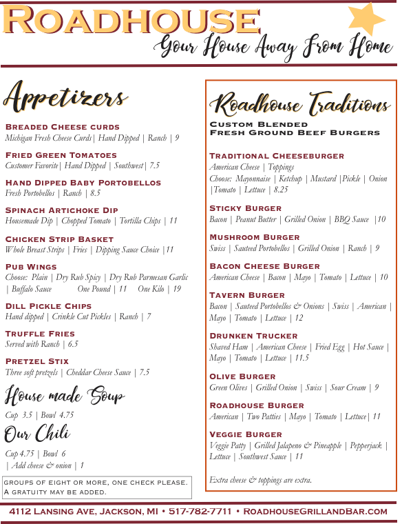 Welcome to Roadhouse - Jackson, a delightful dining destination nestled in the heart of Jackson, MI. This charming spot showcases an eclectic menu that effortlessly blends comfort food with unique culinary twists. Start your meal with Truffle Fries or the highly adored Fried Green Tomatoes, both perfectly paired with house-made sauces.
